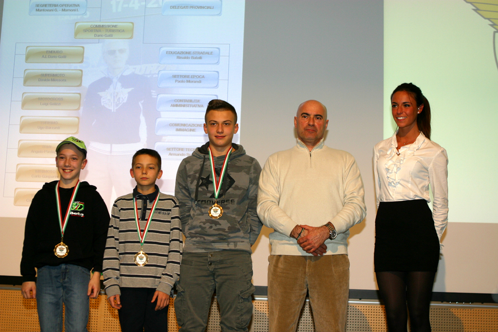13. I campioncini del minicross regionale Lesiardo, Zanardelli e Rusi con la presidentessa del Cairatese, Patrizie Colombo (per il titolo a squadre di club), premiati da Riccardo Tagliabue, responsabile nazionale della supermoto.