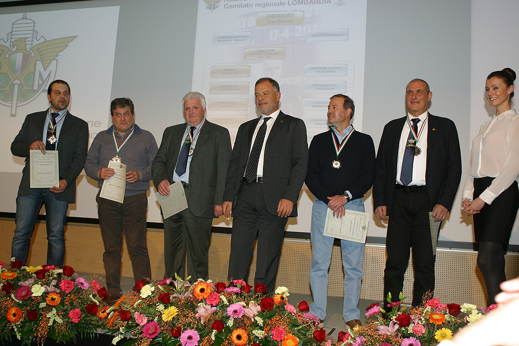16. Per il mototurismo, ecco i vincitori del Trofeo Lombardia conduttori: Barzaghi, Terraneo, Viola, Von Wunster e Buzzoni, con il procuratore FMI, avv. De Girolamo (al centro).